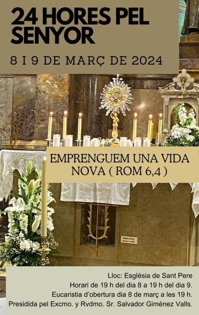 |19-02-24| Els pròxims 8 i 9 de març tindrà lloc l'exposició al Santíssim que es fa habitualment a la parròquia de Sant Pere, però durarà 24 hores. Començarà el divendres dia 8 de març a les 19:00 hores i acabarà el dissabte a la mateixa hora. Precisament, l'inici d'aquestes 24 hores serà amb una Eucaristia que presidirà el bisbe Salvador Giménez.