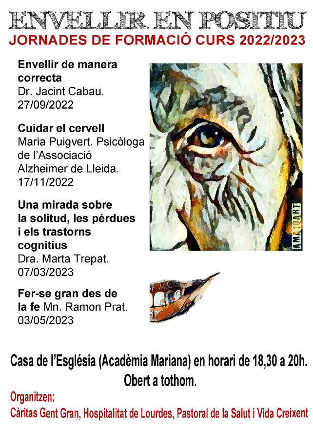 Càritas Gent Gran, l'Hospitalitat de Lourdes, la Pastoral de la Salut i Vida Creixent organitzen per a aquest curs 2022-23 unes Jornades de Formació titulades "Envellir en positiu", que pretenen posar l’accent en el tema de l’envelliment des de diferents vessants, el biològic, el cerebral, el psicoafectiu o l'espiritual. La idea de les quatre entitats organitzadores és que aquesta iniciativa pugui tenir continuïtat en propers cursos.