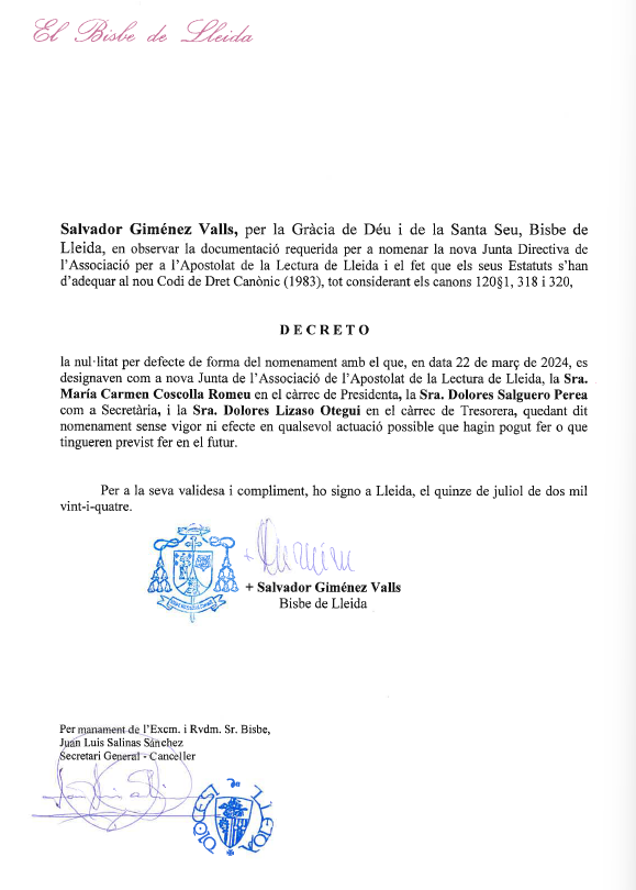 Anul·lat el nomenament de la Junta de l'Associació de l'Apostolat de la Lectura
