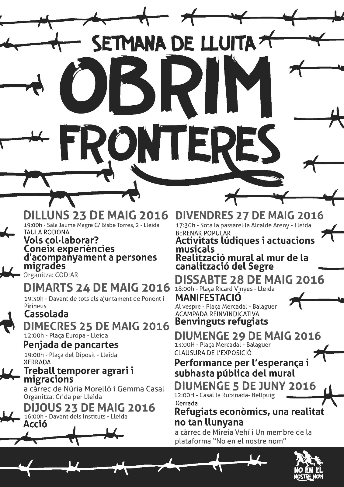 A continuació us adjuntem els actes que tindran lloc al llarg d'aquesta setmana dintre de la campanya 'Obrim les fronteres' organitzada per la plataforma 'No en el Nostre Nom'.