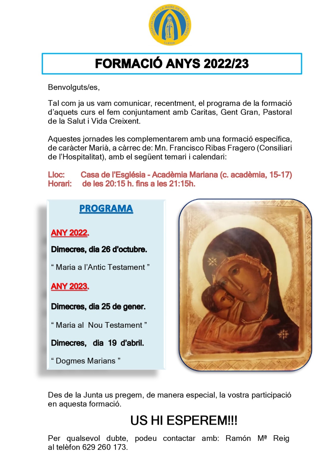 La Hospitalitat de la Mare de Déu de Lourdes pone en marcha, junto con Càritas, Gent Gran, Pastoral de la Salud y Vida Creixent el programa de formación de este curso 2022-23, que empezará el próximo 26 de octubre. Las jornadas se complementan con una formación específica de carácter Mariano, a cargo de mosén Francisco Ribas Fragero, consiliario de la Hospitalidad.