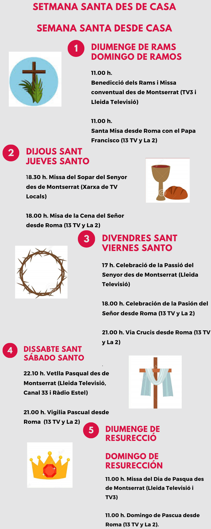 Us dejamos con los horarios para seguir esta Semana Santa tan especial desde nuestra casa a través de los medios de comunicación.