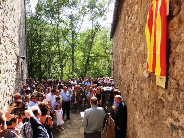 Tras la intervención del alcalde, Vinyet Mora, sobrina nieta de Mossèn Joan, subida a los brazos de su padre, descubrió el nombre de la plaza que hasta entonces cubría una bandera. Padre Joan Ramon obsequió con una fotografía mural de Mn. Juan en Troguet, quien la situó al pie del retablo que preside la Iglesia Vieja. Fue un momento muy chocante. La hasta ahora llamada "plaza de Misa" ya es oficialmente la plaza de Mossèn Joan.