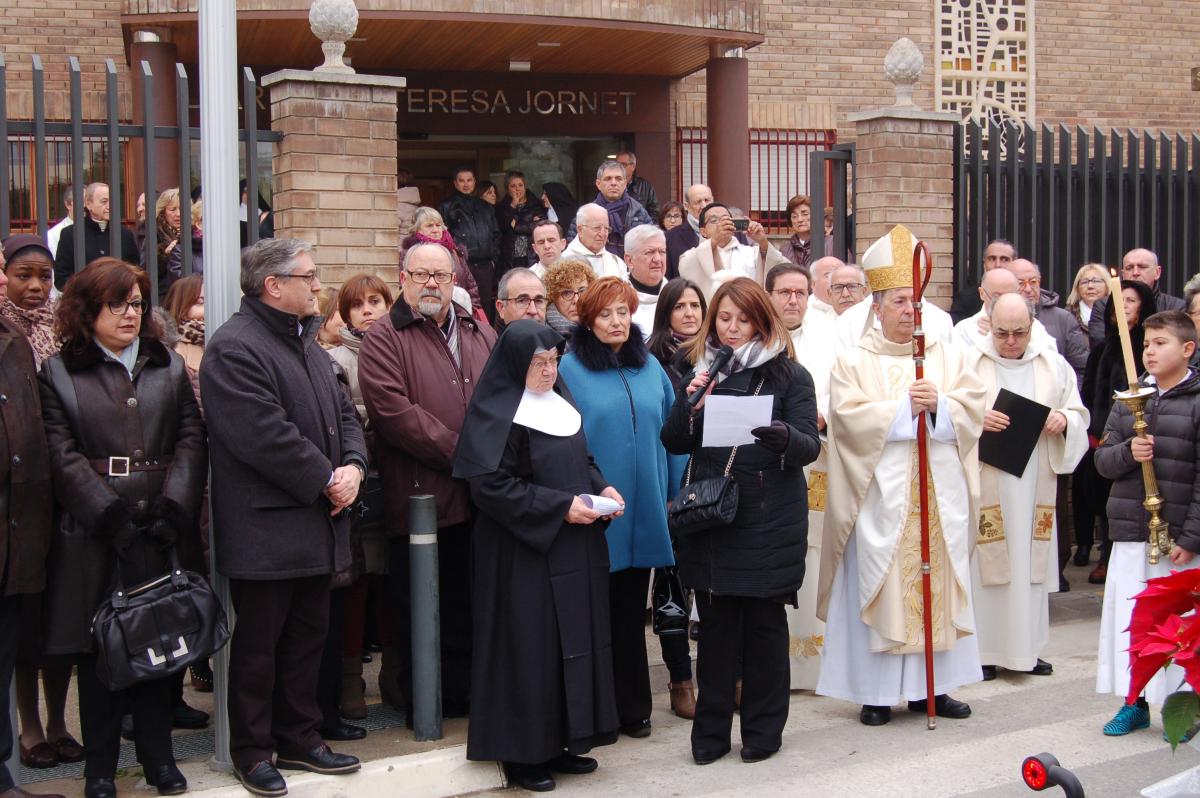 Seguidamente, y ya ante la antigua Casa Asilo, la Rvda. Madre Provincial entregó la llave a la Madre Secretaria General, con la que abrió la puerta acompañada por el obispo de la diócesis y la Alcaldesa de Aitona. Con las puertas de par en par, Mons. Salvador Giménez hizo una plegaria y bendición de la reforma, entrando luego en su interior la imagen de Santa Teresa Jornet y reviviendo así el momento en el que la fundadora entrara por primera vez en esta casa Asilo de su pueblo hace casi 127 años.