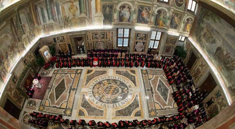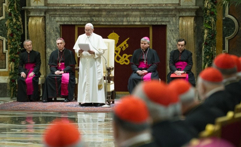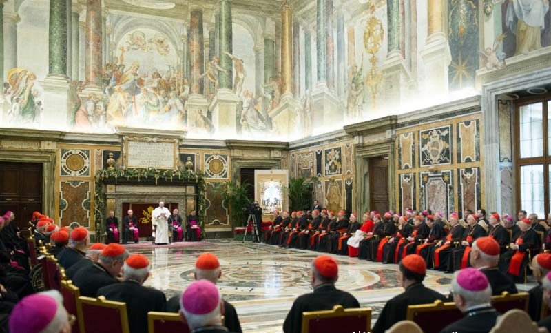 El Papa Francisco ofreció, este lunes 22 de diciembre, en su discurso a los cardenales y monseñores de la Curia romana para felicitarles la Navidad en la Sala Clementina del Vaticano, un catálogo de probables enfermedades o tentaciones, y animó a confesarse para preparar el corazón para la fiesta del nacimiento de Jesús.