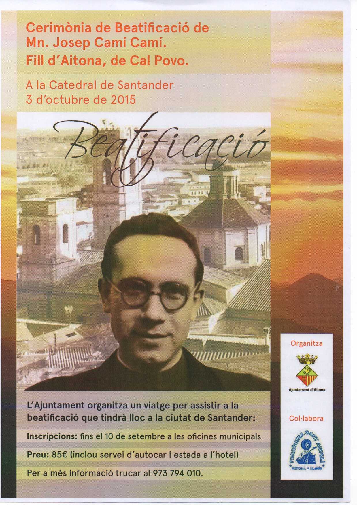 El dissabte dia 3 d’octubre, a les 12 del matí, tindrà lloc a la Catedral de Santander (Cantàbria) la beatificació de mossèn Josep Camí Camí, màrtir d’Aitona que passarà a formar part del grup dels Màrtirs de Viaceli (de l’orde cistercenc de Cobreces). Pels interessats en assistir a la cerimònia, el dia anterior, 2 d’octubre, a la 1 del migdia, partirà d’Aitona un autobús que es dirigirà a Santander.